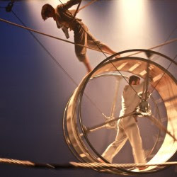 It’s a world of constant motion that sees the performers climbing up ropes and spinning the giant wheel in a ballet of perfect unison. Ropes connected to the wheels via a series of pulleys make the five work as one unit. If one piece of the chain fails all fail. Even in moments when technical hitches, such as a tangled rope, delay the action, the cast adapt seamlessly.